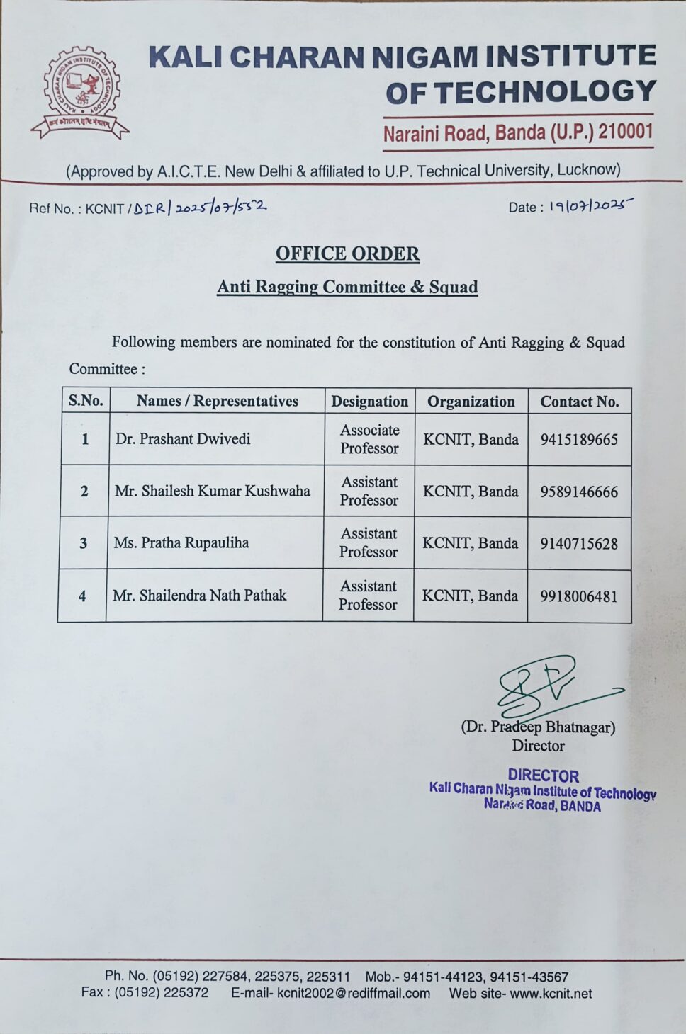 KCNIT, Banda is a NO-RAGGING Zone.
